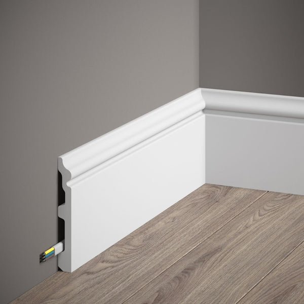 Plinta MD358 are un design clasic, universal, care va completa orice incapere, indiferent de stilul interior ales. Are in spate un spatiu special, in spatele caruia poti ascunde fire cu aspect inestetic. Materialul PolyForce garanteaza rezistenta la razele UV si la apa. Rezistenta totala la apa inseamna ca plinta poate fi instalata in incaperi expuse contactului constant cu umezeala. Plinta decorativa pentru interior MD358 reflectă eficient razele soarelui, prevenind formarea îngălbenirii sau decolorării inestetice. Plinta din polimer dur MD358 are tehnologia inovatoare ScratchShield, datorită căreia materialul devine mult mai dur, iar suprafața câștigă protecție suplimentară în cazul încercării de a o zgâria cu o unealtă ascuțită. Banda a fost acoperită cu un grund de netezire, care facilitează vopsirea cu vopsea pe bază de apă.